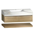 The Aventino 48-inch hotel-style floating double-sink vanity is a wall-mounted piece designed around three materials: a sintered stone top, ceramic basins, and a plywood cabinet. A single open shelf runs below the drawer bank — towels within reach, storage out of sight.