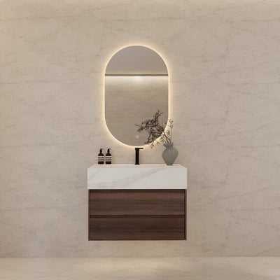 - Sintered stone top with dual integrated ceramic basins