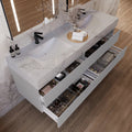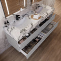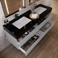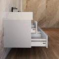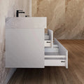 Inside the cabinet: Blum TandemBox soft-close drawer slides and hinged door sections with soft-close hardware. The vanity ships pre-assembled and wall-mounts with concealed bracket hardware. Matching ceramic backsplashes are included. Available in two widths: 60-inch and 71-inch.