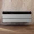 The top is 4¾-inch thick sintered stone, integrated with two ceramic basins to remove the seam where water usually pools. Sintered stone is heat-resistant, stain-resistant, and easier to keep clean than polished natural stone. Five top finishes are available: Black Marquina with gold veins, Calacatta Black, White Carrara, Calacatta Gold, and Ice Grey.