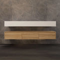 The Aventino 71-inch oak plywood floating double-sink vanity is a wall-mounted piece designed around three materials: a sintered stone top, ceramic basins, and a plywood cabinet finished in Light Oak or Smoked Oak. The grain reads clearly on the flat front; nothing competes with it.