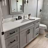 Three cabinet finishes pair with four handle options and two quartz countertop colours, so this 48" single sink can be specified for a quiet primary bath, a bright ensuite, a family bathroom, or a guest suite. The countertop arrives with a matching backsplash and sidesplash, pre-drilled for a standard single-hole faucet, and the sink is bonded into the slab at the factory.